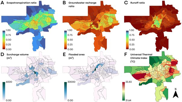 Abb.3: Der aktuelle Stand in Innsbruck hinsichtlich Hochwasserrisiko, Wasserhaushalt und Hitzebelastung. A, B und C – Aufschlüsselung der Komponenten des Wasserhaushalts: Evapotranspiration, Grundwasserneubildung und Abfluss. D – Hochwasservolumen. E – Überflutete Fläche. F – Hitzebelastung für den Menschen basierend auf dem Universal Thermal Climate Index (UTCI) an einem heißen Tag mit einer Lufttemperatur von 31,2 °C.