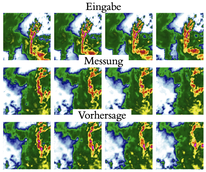 Auf Basis der Projektergebnisse entwickelte das Team zudem einen Prototyp für eine KI-basierte Kurzfrist-Niederschlagsvorhersage. Das Modell verarbeitet Bilddaten aus Radar- und Satellitenmessungen und erzeugt innerhalb weniger Sekunden 5-minütliche Prognosen für die nächsten 60 Minuten.