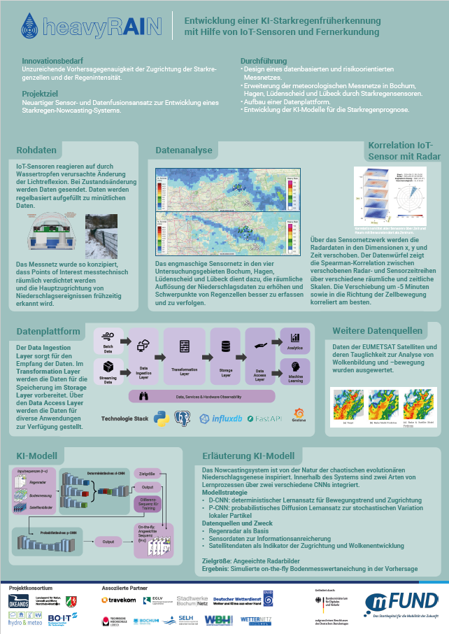 Mit dieser Frage beschäftigte sich das Forschungsprojekt heavyRAIN. Nach drei Jahren Laufzeit hat das Projektkonsortium nun zentrale Ergebnisse vorgestellt. Ziel war es, Starkregen mithilfe von Künstlicher Intelligenz, IoT-Sensorik und Fernerkundungsdaten früher zu erkennen und Kommunen sowie Infrastrukturbetreibern eine bessere Grundlage für rechtzeitige Maßnahmen zu geben.