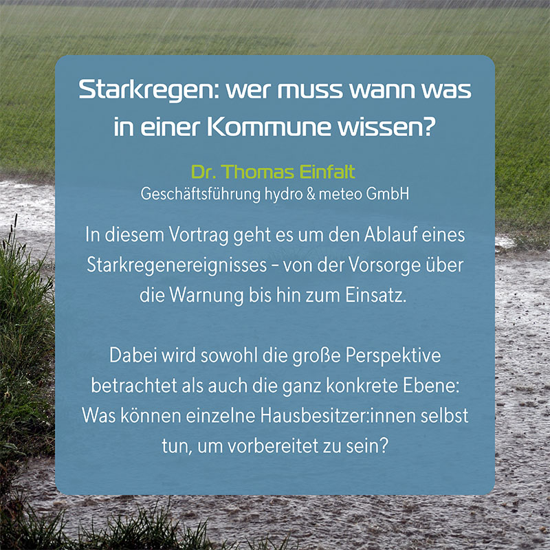 In seinem Vortrag: „Starkregen: Wer muss was wann in einer Kommune wissen?“ wird Thomas sowohl den Ablauf eines Starkregenereignisses – von der Vorsorge über die Warnung bis zum Einsatz erläutern, als auch ganz konkret Hinweise für Hausbesitzer:innen geben.
